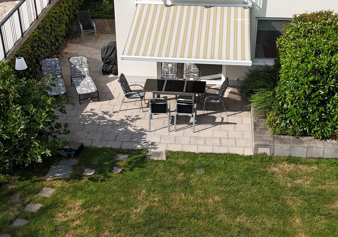 - Große Südterrasse mit Markise und Gartenmöbel